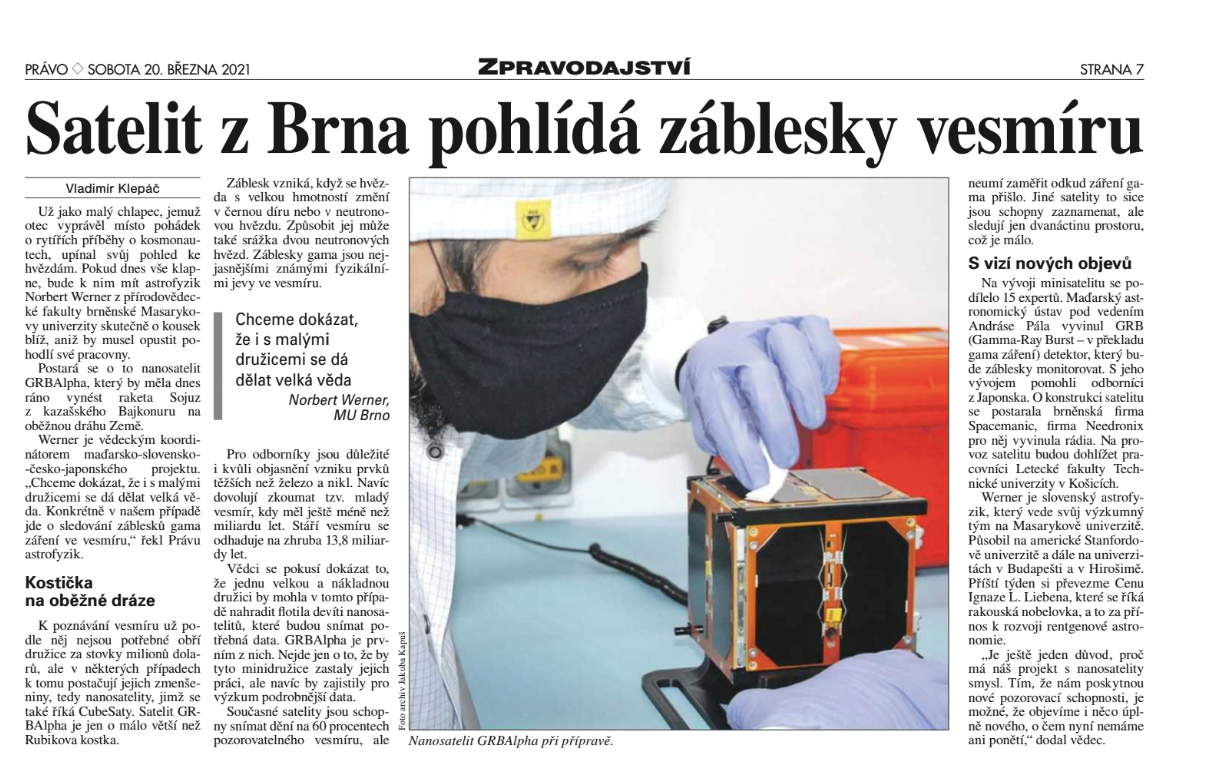 Soustava malých detekčních zařízení o velikosti a tvaru zhruba jako krabice na láhev vína, obíhající kolem Země. Takové je nejnovější řešení vědců zabývajících se detekcí a monitorováním záblesků gama záření, což je z hlediska astrofyziky zcela zásadní jev, který trvá jen zlomky až několik desítek sekund a které se dosud daří zachytit jen ve výjimečných případech. Vlajková loď zvažované flotily v podobě nanosatelitu s označením GRBAlpha poletí do vesmíru již v sobotu 20. března (poznámka: nakonec vzlétla až v pondělí 22. března) jako sekundární náklad rakety Sojuz, která startuje z kazašského kosmodromu Bajkonur.