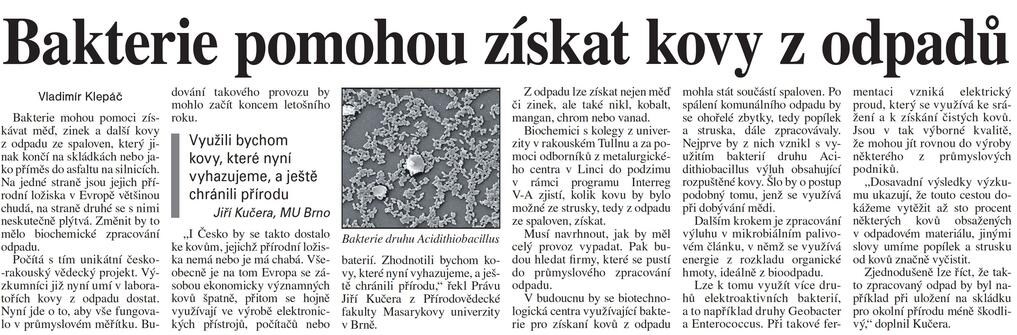 „Bakteriální produkce kyseliny sírové je ekologičtější a levnější než její chemická výroba, navíc jsou produkovány povrchově aktivní látky, které přispívají k rozpouštění kovů. Díky tomu je možné převést vzácné kovy, které se nachází ve strusce a popílku, do roztoku zvaného výluh,“ popsal výhody postupu Jiří Kučera z Ústavu biochemie Přírodovědecké fakulty Masarykovy univerzity. Připustil, že postup bioloužení kovů z minerálních rud je vědcům známý již několik desítek let a v zahraniční se využívá zejména k těžbě mědi.